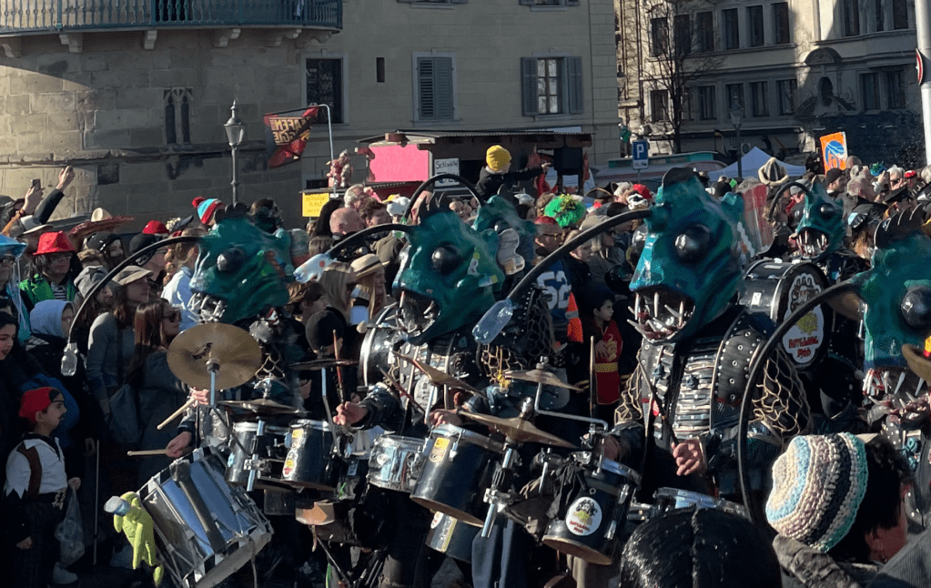 Zur Parade gehört zu jeder Gruppe auch Musik und ein Wagen. Manche machen ihre eigene Musik, andere haben Lautsprecher. Die traditionelle Musik zur Fasnacht ist die Guggenmusik. Endlich können die Blasinstrumente mal so richtig Krach machen und glänzen!